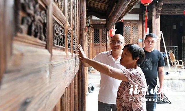 7月12日,在位于闽侯县白沙镇林柄村的百年古厝李宅里,江月英一边抚摸着修缮一新的窗框和雕花,一边向身旁的年轻人孔祥锋讲述李宅的故事。2019年,他们因为一张“古厝认养协议”结缘,李宅也因此迎来“新生”。